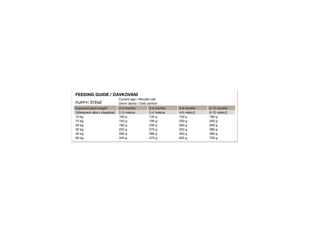 : Jídlo podávejte suché, nebo zalité vodou. Po úvodním období krmte svého psa denními dávkami podle hmotnosti psa na tabulce. Doporučená denní porce je pouze orientační. Množství denního krmiva závisí na kondici a věku psa. Pokud má pes nadváhu, snižte denní porce o 10 %. Pokud má pes podváhu, zvyšte denní dávku o 10%. Vždy by měla být k dispozici čistá, čerstvá voda. Skladujte na suchém místě.
