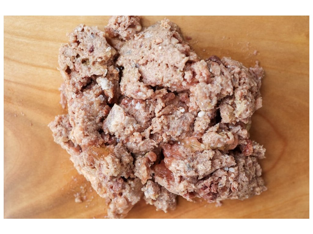 Jehněčí maso 70 % (z plemene Charollais), zeleninový vývar 28,8 %, lněný olej 0,2 % (za studena lisovaný).