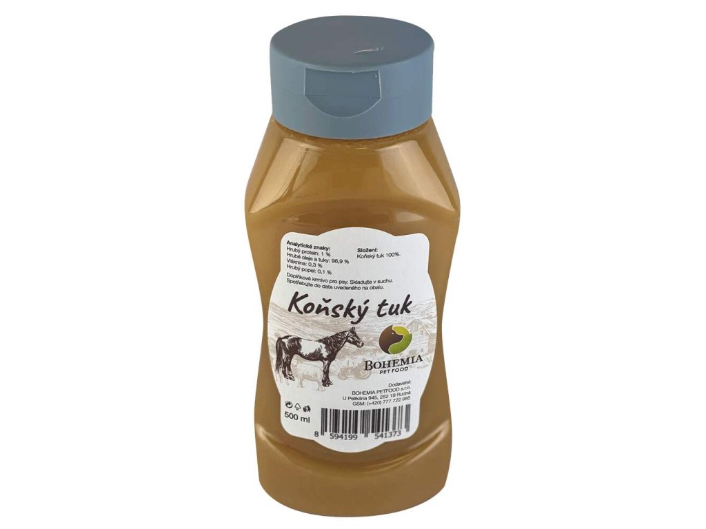 Koňský tuk bezesporu patří ke světové špičce produktů s obsahem esenciálních omega-3 mastných kyselin, výrazně podporuje správný růst a vývoj organismu. Pomůže předejít zdravotním problémům psa či kočky a podpořit jejich celkový vzhled, kondici a imunitní systém. Doporučujeme tento čistý přírodní doplněk přidávat k jakékoli stravě.