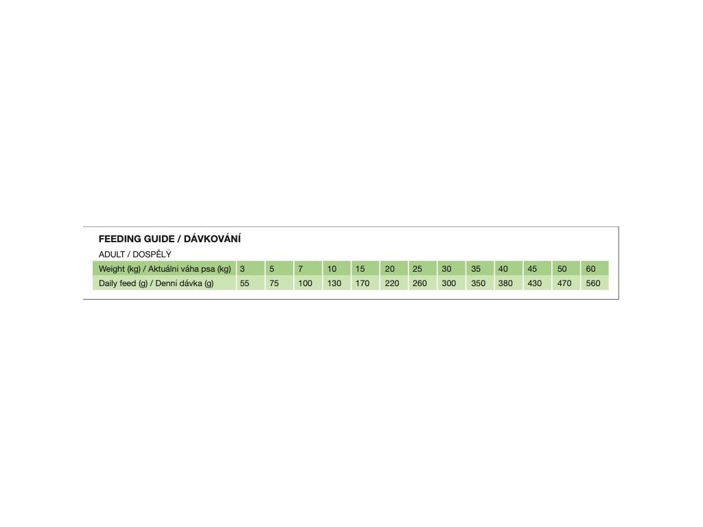NÁVOD K POUŽITÍ: Jídlo podávejte suché, nebo zalité vodou. Po úvodním období krmte svého psa denními dávkami podle hmotnosti psa na tabulce. Doporučená denní porce je pouze orientační. Množství denního krmiva závisí na kondici a věku psa. Pokud má pes nadváhu, snižte denní porce o 10 %. Pokud má pes podváhu, zvyšte denní dávku o 10%. Vždy by měla být k dispozici čistá, čerstvá voda. Skladujte na suchém místě.