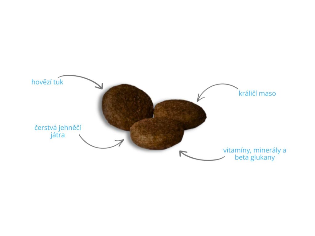 SLOŽENÍ: sušené králičí maso (29%), batáty, bramborové vločky, hovězí tuk (14%), čerstvá jehněčí játra (5%), sušená dýně (2%), sušená jehněčí játra (2%), sušená mrkev (1,2%), lněné semeno, sušený kořen čekanky, extrakt z juky, beta glukany, extrakt z chrupavek, směs vitamínů a minerálů.